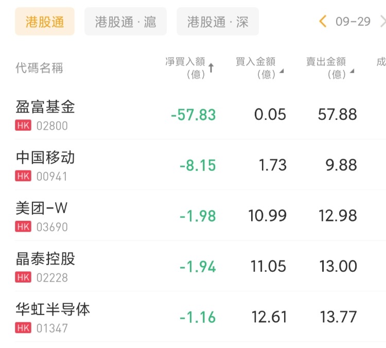 盈富基金、中国移动、美团-W分别遭净卖出57.83亿港元、8.15亿港元、1.98亿港元。