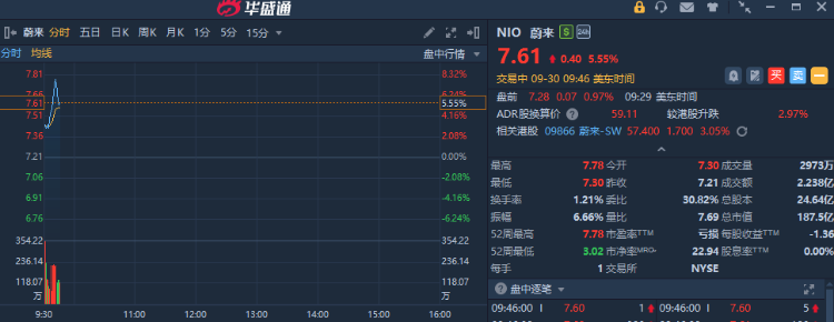 新能源汽车股走强,蔚来一度大涨近8%,现涨超5%,公司9月第四周销量大增;理想汽车涨超4%,小鹏汽车涨超3%。