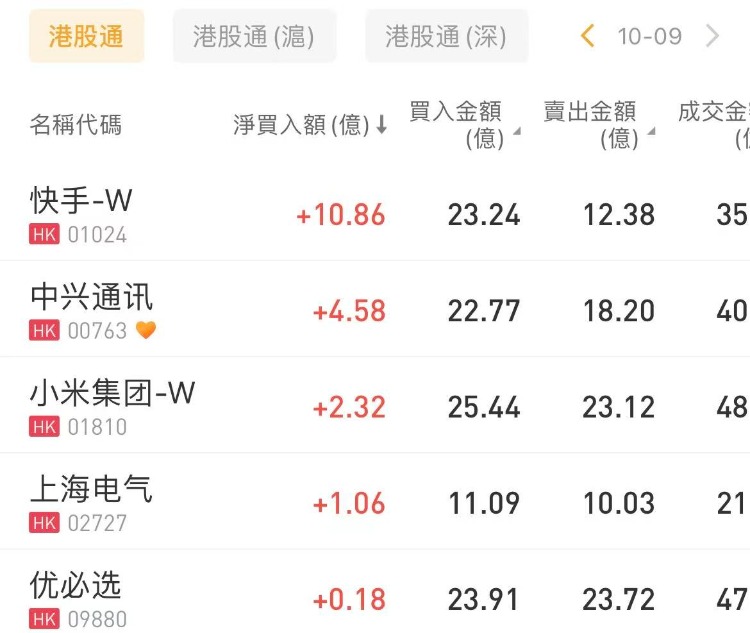 快手-W、中兴通讯、小米集团-W分别获净买入10.86亿港元、4.58亿港元、2.32亿港元;