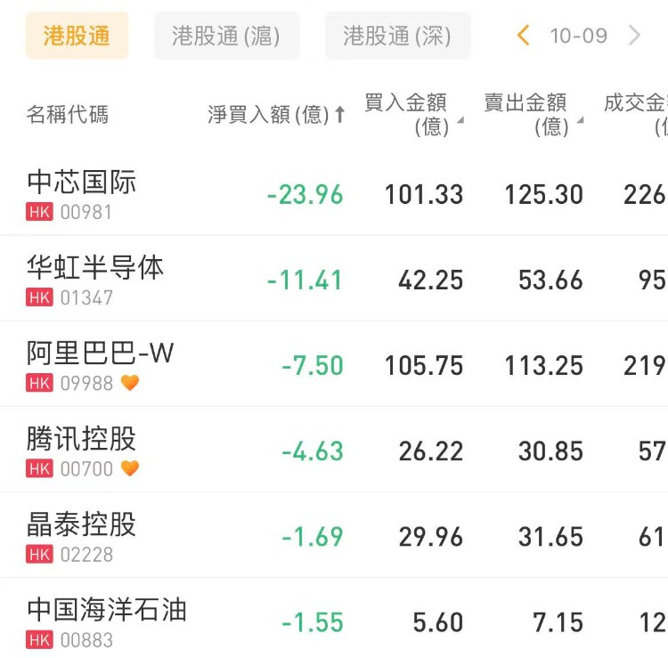 中芯国际、华虹半导体、阿里巴巴分别遭净卖出23.96亿港元、11.41亿港元、7.50亿港元。