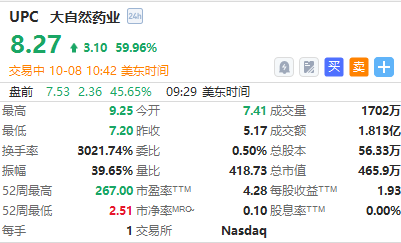 其他中概股大自然药业飙升近60%,天境生物涨超24%。