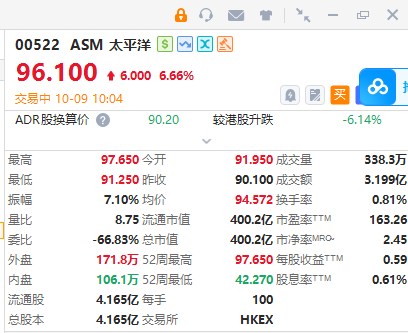 ASM太平洋(00522)涨超6%,截至发稿,涨6.66%,报96.1港元,成交额超3亿港元。