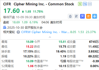 加密矿企普涨,Cipher Mining $CIFR 涨超6%,Bitfarms $BITF 涨超3%, $IREN 涨超1%;