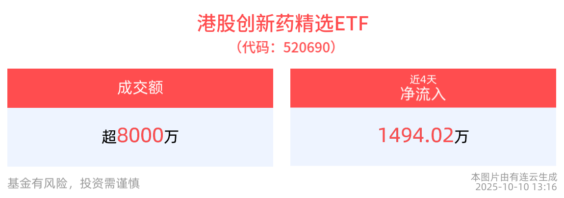 截至2025年10月10日 13:16,恒生港股通创新药精选指数下跌0.61%。成分股方面涨跌互现,石药集团领涨2.23%,丽珠医药上涨1.45%,先声药业上涨1.35%;诺诚健华领跌9.63%,荣昌生物下跌7.86%,药捷安康-B下跌5.43%。港股创新药精选ETF(520690)下跌0.89%,最新报价1元。拉长时间看,截至2025年10月9日,港股创新药精选ETF成立以来累计上涨2.63%。