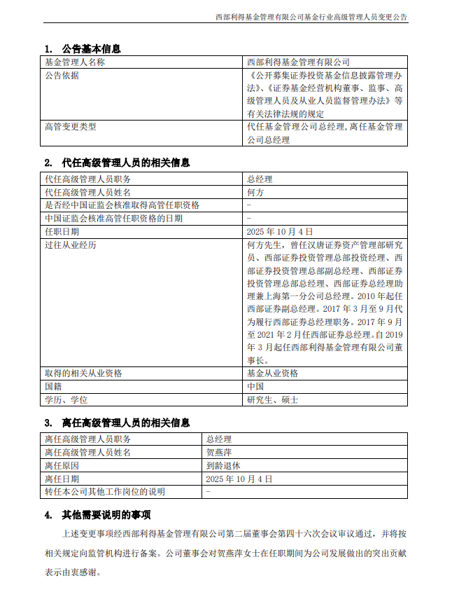 10月10日,西部利得基金发布高管变更公告,公司总经理贺燕萍到龄退休,离任公司总经理职务,董事长何方代任。