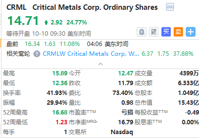 美股稀土概念股延续涨势,Critical Metals $CRML 涨超11%,隔夜涨超24%;USA Rare Earth $USAR 涨近5%、Energy Fuels $UUUU 、 $MP 涨超2%。