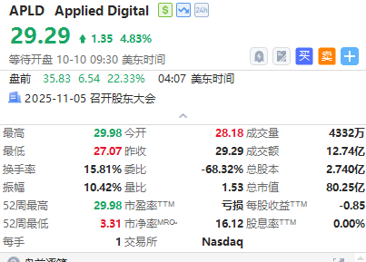 Applied Digital美股盘前大涨22%,一季度营收暴涨84%至6420万美元,超出市场预期。