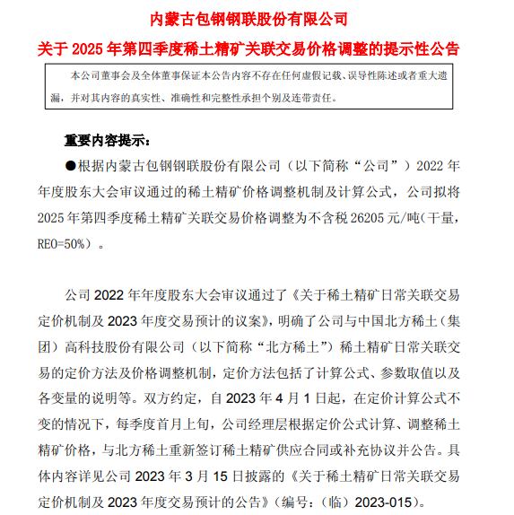 10月10日,包钢股份(600010.SH)发布公告称,根据公司2022年年度股东大会审议通过的稀土精矿价格调整机制及计算公式,公司拟将2025年第四季度稀土精矿关联交易价格调整为不含税26205元/吨(干量,REO=50%)。REO每增减1%,不含税价格增减524.10元/吨。