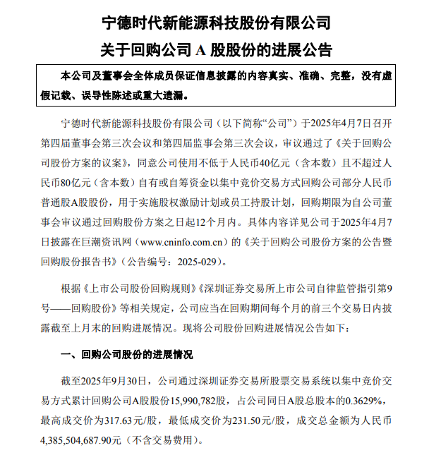 10月10日,宁德时代公告,截至2025年9月30日,公司通过深圳证券交易所股票交易系统以集中竞价交易方式累计回购公司A股股份15990782股,占公司同日A股总股本的0.3629%,最高成交价为317.63元/股,最低成交价为231.50元/股,成交总金额为人民币4385504687.90元(不含交易费用)。