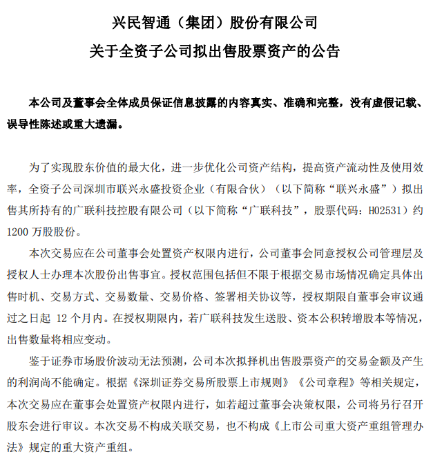 10月10日,兴民智通(002355.SZ)公告称,全资子公司联兴永盛拟出售其所持有的广联科技约1200万股股份,交易方式包括集中竞价、大宗交易、纸质股票交易等。