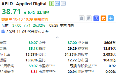 AI数据中心公司Applied Digital涨幅扩大至32%,股价创历史新高,年内累涨逾400%,公司第一财季营收暴涨84%超预期。