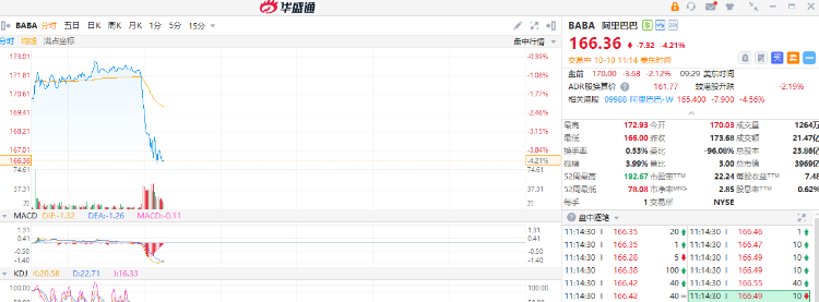 华盛资讯10月10日讯,热门中概股短线跳水!万国数据跌超7%,哔哩哔哩跌超5%,阿里巴巴、百度、京东跌超4%,拼多多跌超2%。