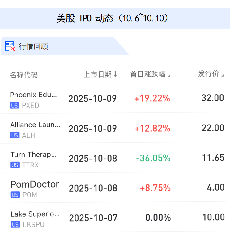 美股方面,本周共有5只新股上市,其中Phoenix Education Partners ( $PXED ) 上市首日涨19.22%,报38.15美元。据悉,该公司致力于通过灵活的学习模式、与技能相匹配的课程体系和可承受的学费,为学生提供个性化、与职业相关的、价格合理的教育。