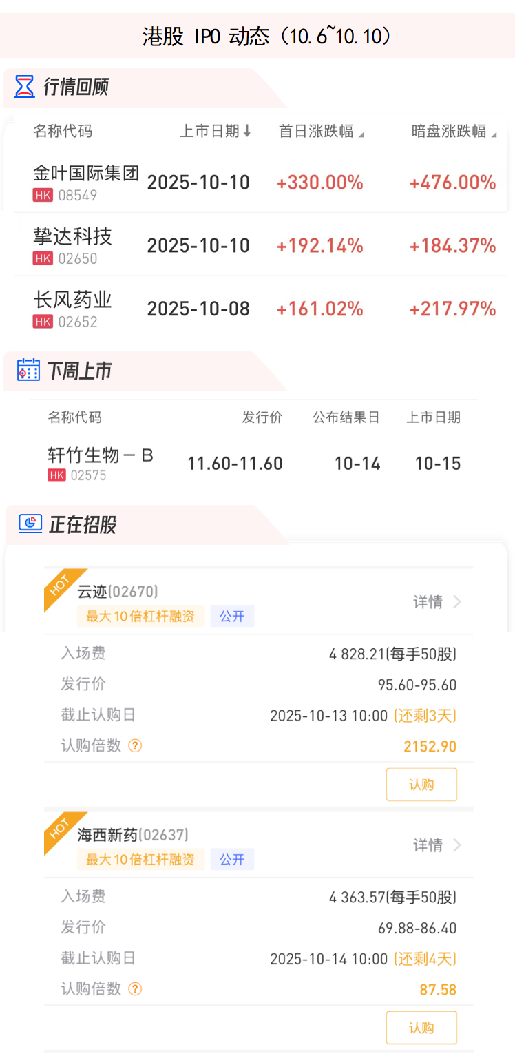 目前,云迹、海西新药两只新股正在火热招股中,前往新股中心认购>> 。轩竹生物已结束招股, 将于下周挂牌港股上市,孖展超购逾3900倍,已认购投资者留意中签结果。