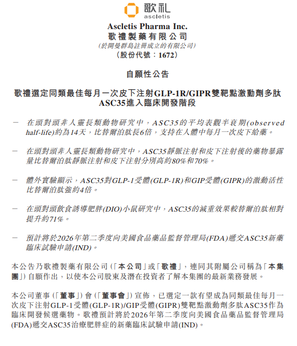 10月13日,歌礼制药在港交所公告,已选定一款有望成为同类最佳每月一次皮下注射GLP-1受体(GLP-1R)/GIP受体(GIPR)双靶点激动剂多肽ASC35作为临床开发候选药物。