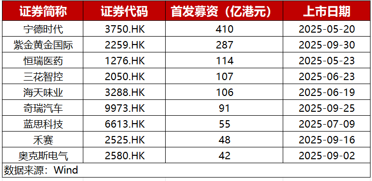 截至10月14日,港股2025年共有70余家企业完成IPO,5家企业募资超过百亿港元,宁德时代募资410亿,为港股年内最大IPO。