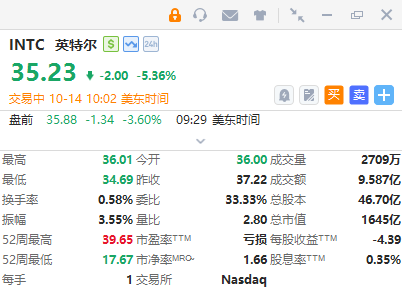 华盛资讯10月14日讯,英特尔(INTC.US)跌超5%,报35.23美元。