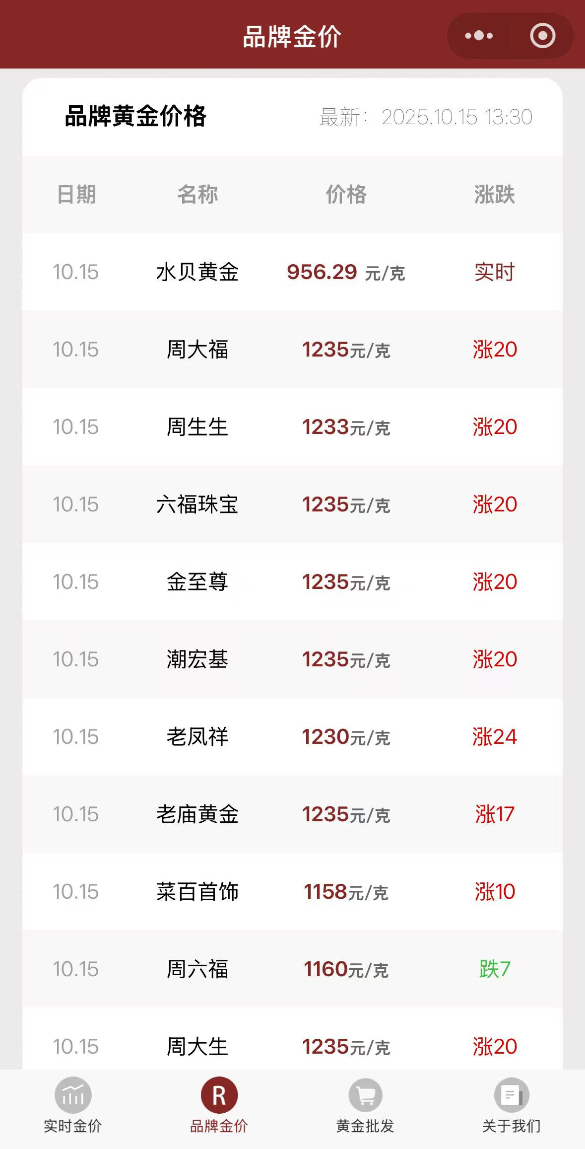 今年以来,国际金价持续攀升,屡创历史新高。截至发稿,伦敦金现涨至4186.74美元/盎司,今年以来,现货黄金价格涨超50%。与此同时,国内各品牌金饰克价也纷纷上涨。今日金价小程序显示,10月15日,周大福、周生生、六福珠宝、潮宏基等多个金饰品牌黄金价格较前日上涨20元/克,涨至1235元/克。老凤祥足金饰品标价则较前日上涨24元/克。