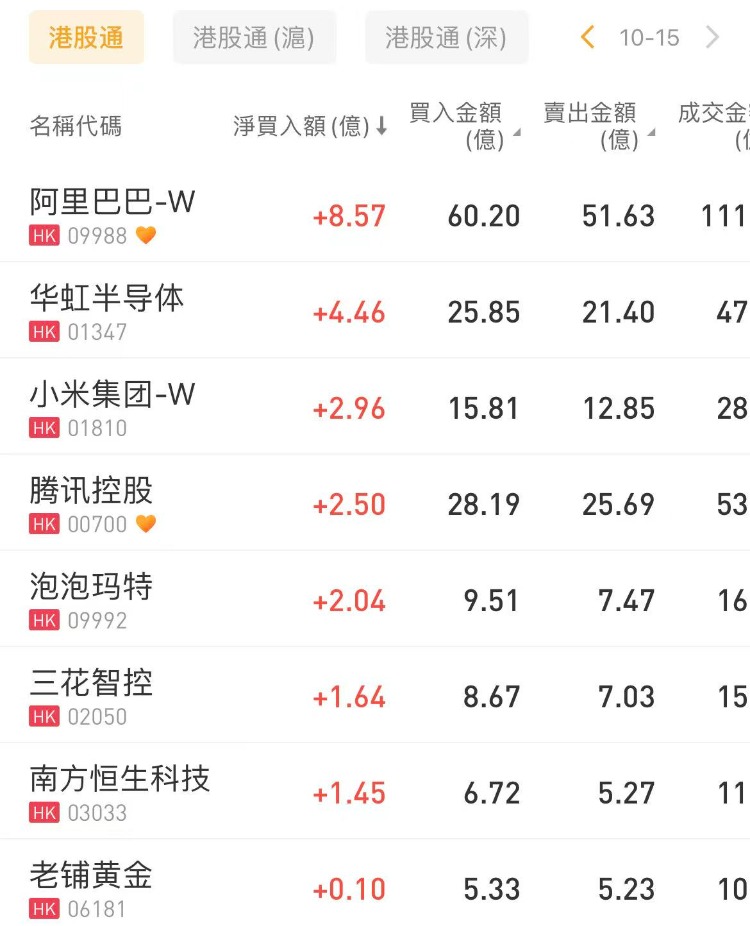 北水净买入最多的个股是阿里巴巴-W、华虹半导体、小米集团-W,分别净买入8.57亿港元、4.46亿港元、2.96亿港元。