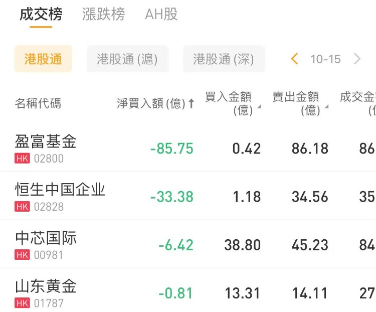 北水净卖出最多的个股是盈富基金、恒生中国企业、中芯国际,分别净卖出85.75亿港元、33.38亿港元、6.42亿港元。