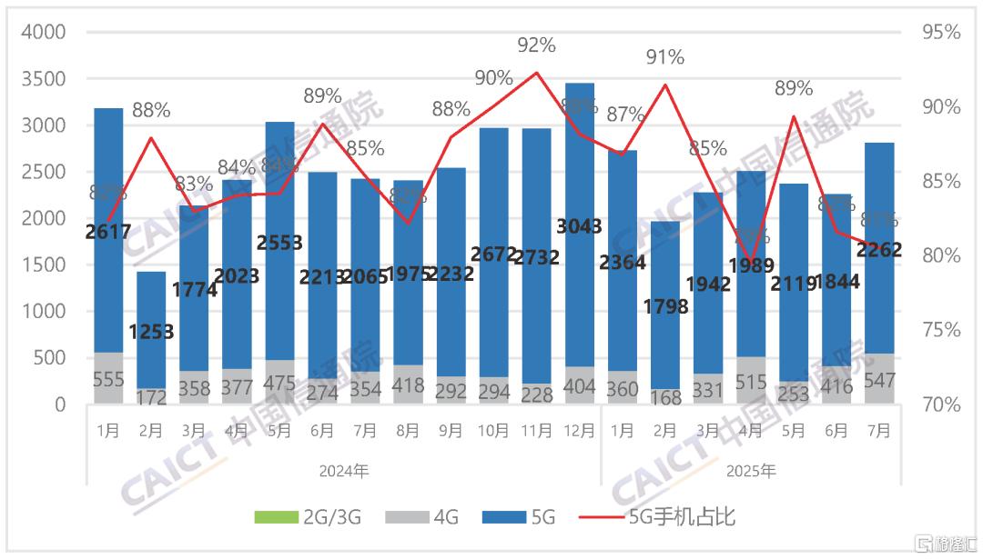 2025年7月,国内市场手机出货量2809.3万部,同比增长16.1%,其中,5G手机2262.1万部,同比增长9.5%,占同期手机出货量的80.5%。