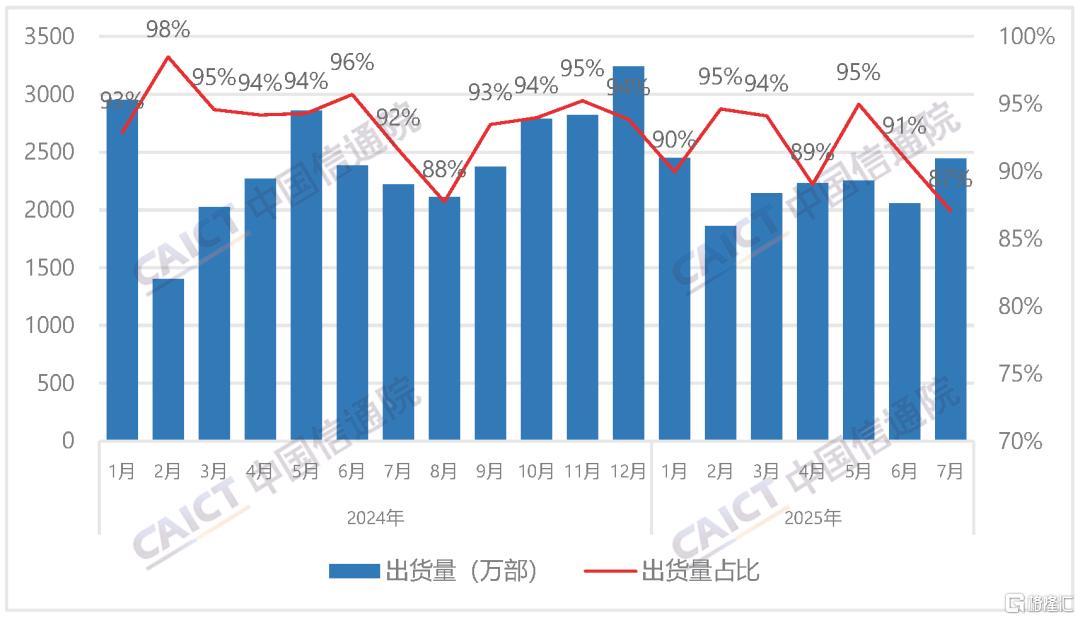 2025年7月,智能手机出货量2445.4万部,同比增长10.3%,占同期手机出货量的87.0%;智能手机上市新机型28款,同比增长55.6%,占同期手机上市新机型数量的58.3%。