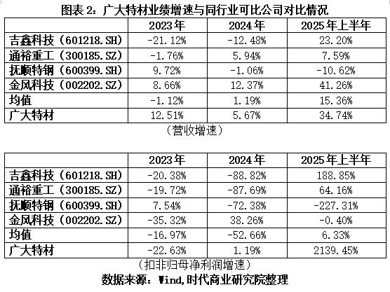 如图表2所示,2023—2024年及2025年上半年,广大特材营收同比增长率分别为12.51%、5.67%、34.74%;扣非归母净利润同比增长率分别为-22.63%、1.19%、2139.45%。同期,同行业可比公司营收同比增速均值分别为-1.12%、1.19%、15.36%;扣非归母净利润同比增速均值分别为-16.97%、-52.66%、6.33%。