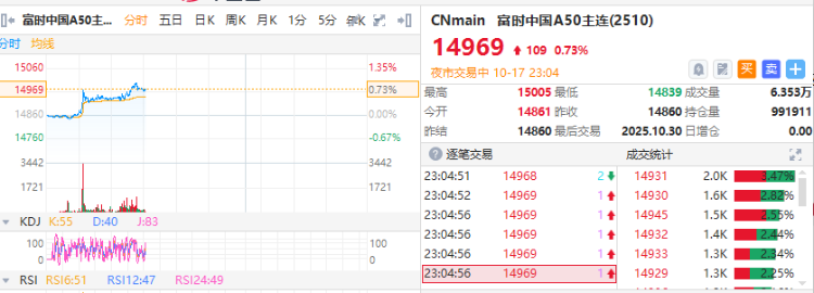 今晚,富时中国A50指数期货直线拉升,截至22:20,涨0.83%,恒指期货、恒生科技指数期货夜盘均大涨超2%;欧洲多国股市跌幅明显收窄,美股三大指数集体拉升;VIX恐慌指数直线跳水,大跌超6%。