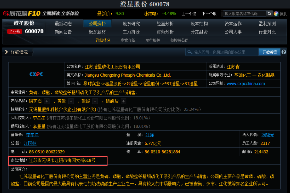 资料显示,江阴市梅园大街618号系澄星股份(600078.SH)办公地址。
