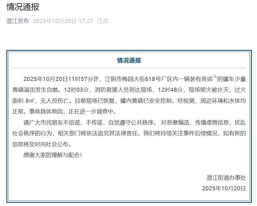 10月20日晚间,澄江发布微信公众号发布情况通报,2025年10月20日11时57分许,江阴市梅园大街618号厂区内一辆装有黄磷的罐车少量黄磷溢出发生自燃。12时03分,消防救援人员到达现场,12时48分,现场明火被扑灭,过火面积8㎡,无人员伤亡。目前现场已恢复,罐内黄磷已安全控制。经检测,周边环境和水体均正常。事故具体原因,正在进一步调查中。
