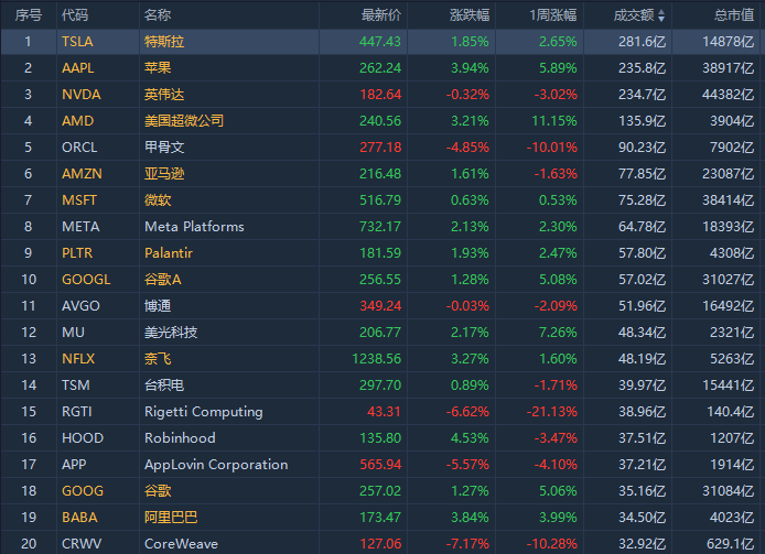 第2名苹果收高3.94%,股价创历史新高,成交235.8亿美元。一份新的报告显示,iPhone 17销售开局良好。Counterpoint研究公司的数据显示,9月上市的iPhone 17系列上市10天内的销量就比iPhone 16系列高出14%。该机构分析师称,基本款iPhone 17对消费者来说非常有吸引力,物有所值。