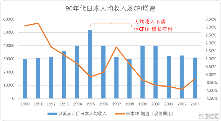 图:90年代日本人均收入(以美元计)及CPI增速,来源:Choice金融客户端