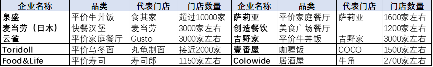 泉盛不是孤例。日本市值前十的餐饮企业中,九家是“平民代表”。只有第十名的Colowide(旗下有牛角、温野菜)算中产餐厅,但也算不上高端。