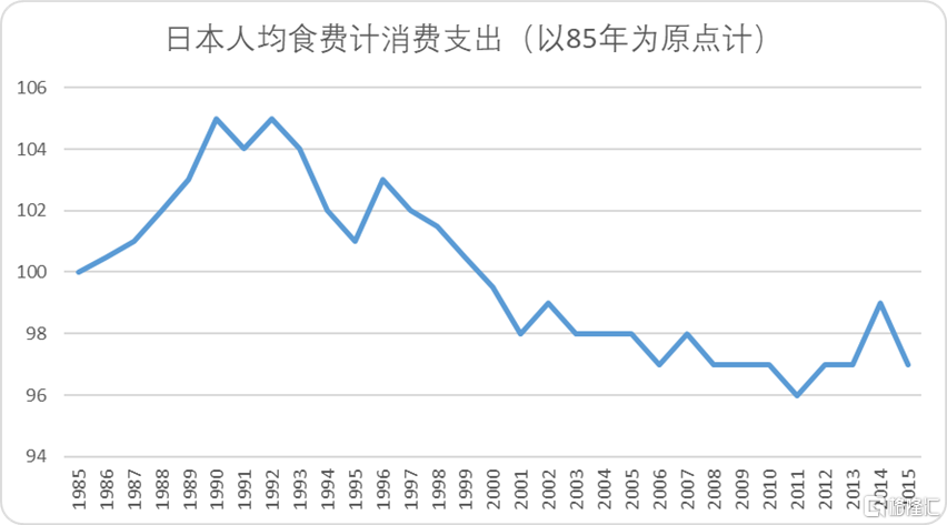 从绝对值看,日本家庭每月食品支出从1992年的8.2万日元跌至2000年的7.4万日元。但比起其他消费的“跳崖式下跌”,餐饮业堪称“泡沫时代的防波堤”。