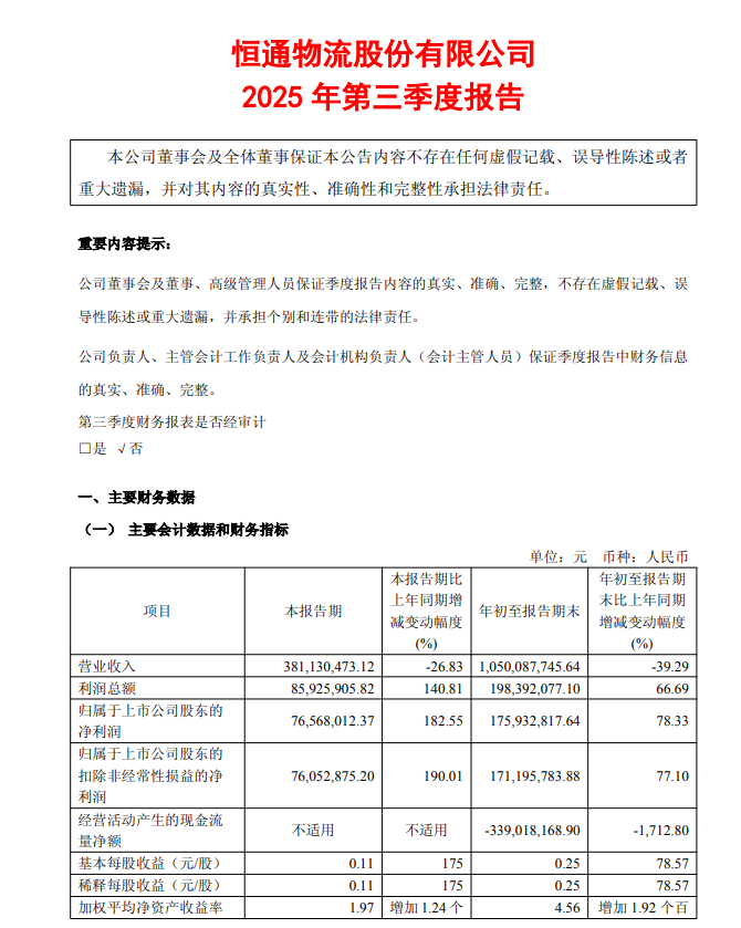 10月21日,恒通股份(603223)发布2025年三季报,公司第三季度营业收入3.81亿元,同比下降26.83%;净利润7656.8万元,同比增长182.55%。前三季度营业收入10.5亿元,同比下降39.29%;净利润1.76亿元,同比增长78.33%;基本每股收益0.25元。