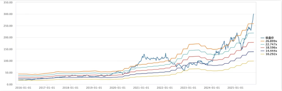 2023年二季度至今,在AI对算力芯片的提振作用下,全球半导体产业又步入景气周期,台积电2024年净利润同比增长36%,2025上半年净利润同比增长60%。在业绩持续增长的背景下,台积电再度迎来戴维斯双击,其估值中枢也再度从15倍提升至30倍以上。