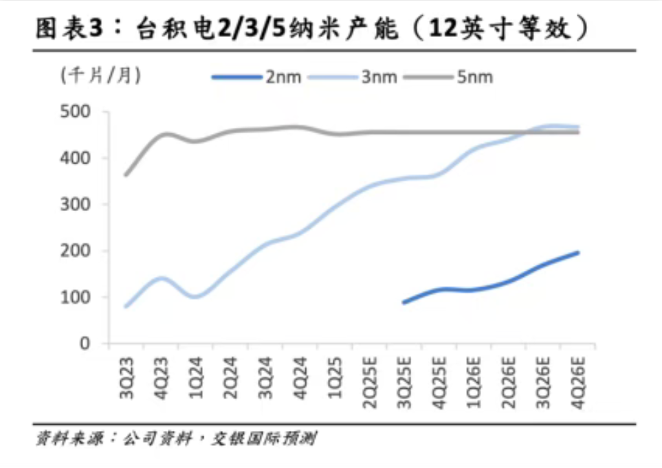 交银国际预测数据显示,台积电3nm制程芯片产能在2026年底可达到40万-50万片/月(12英寸等效),其在美国的3nm产能占比约5%。2nm制程芯片在2026年底可达到20万片/月,此时台积电美国工厂尚未投产。即便按更长期角度看,根据台积电管理层预测,台积电在美国的2纳米产能或占其2纳米总产能的30%。