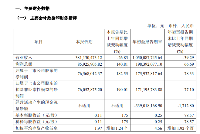 10月21日,恒通股份(603223.SH)发布2025年三季度报告,公司第三季度营业收入3.81亿元,同比下降26.83%;净利润7656.8万元,同比增长182.55%。前三季度营业收入10.5亿元,同比下降39.29%;净利润1.76亿元,同比增长78.33%;基本每股收益0.25元。