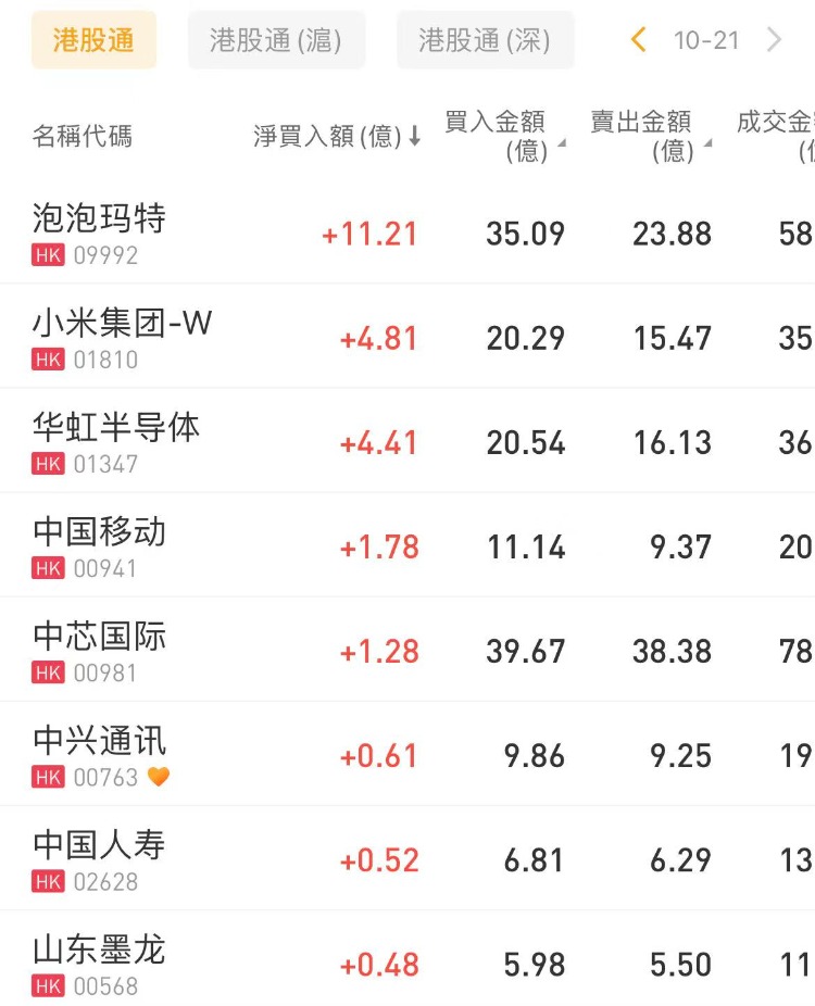 北水净买入最多的个股是泡泡玛特、小米集团-W、华虹半导体,分别净买入11.21亿港元、4.81亿港元、4.41亿港元。