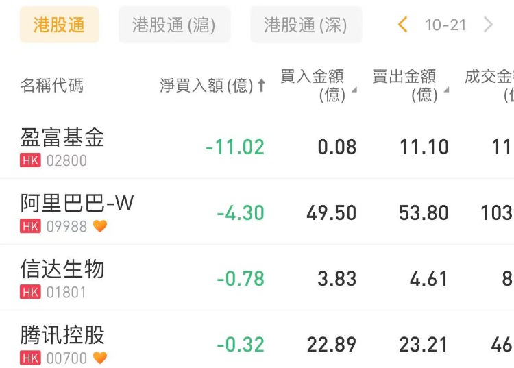 北水净卖出最多的个股是盈富基金、阿里巴巴-W、信达生物,分别净卖出11.02亿港元、4.30亿港元、0.78亿港元。