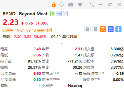 华盛资讯10月21日讯,周二,“人造肉第一股”BeyondMeat盘初续涨超50%,该股昨日大涨超127%。消息面上,据悉公司将在全美2000多家沃尔玛门店扩展分销;