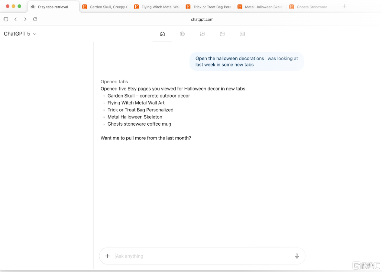 Atlas可在用户同意的前提下,记录浏览历史、偏好与任务进度。AI可据此提供个性化建议,如续写上次未完成的研究报告或提醒未提交的表单。例如,用户可直接提问:“找出我上周浏览过的所有招聘信息,并总结行业趋势以便准备面试。”“找出我上周查看过的万圣节装饰品。”此外,用户可完全查看、删除或暂停记忆功能,OpenAI也强调这些数据不会被用于模型训练。