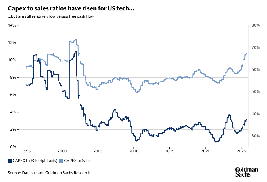 尽管资本支出与销售额之比有所上升,但仍低于历史上的泡沫水平,且杠杆率得到有效控制。大部分支出由企业内部现金流而非债务融资支持,且当前资本支出占自由现金流的比例,已显著低于20世纪90年代末的水平。