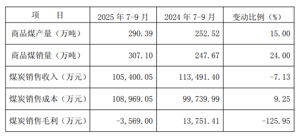 10月22日,大有能源(600403.SH)发布2025年第三季度经营数据公告,公司2025年7-9月商品煤产量290.39万吨,较2024年7-9月同比增长15.00%;商品煤销量307.1万吨,同比增长24.00%;煤炭销售收入10.54亿元,同比下降7.13%;煤炭销售成本10.9亿元,同比增长9.25%。