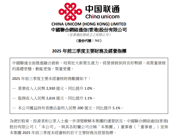 10月22日,中国联通(0762.HK)公布2025年前三季度主要财务及经营指标。前三季度营业收入人民币2,930亿元,同比提升1.0%;公司权益持有者应占盈利人民币200亿元,同比提升5.1%。