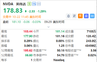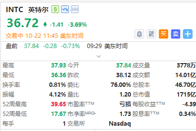 华盛资讯10月22日讯,周三,美股芯片股普跌,截至发稿,英特尔、AMD跌近4%,美光科技跌近3%,台积电、英伟达跌逾1%。