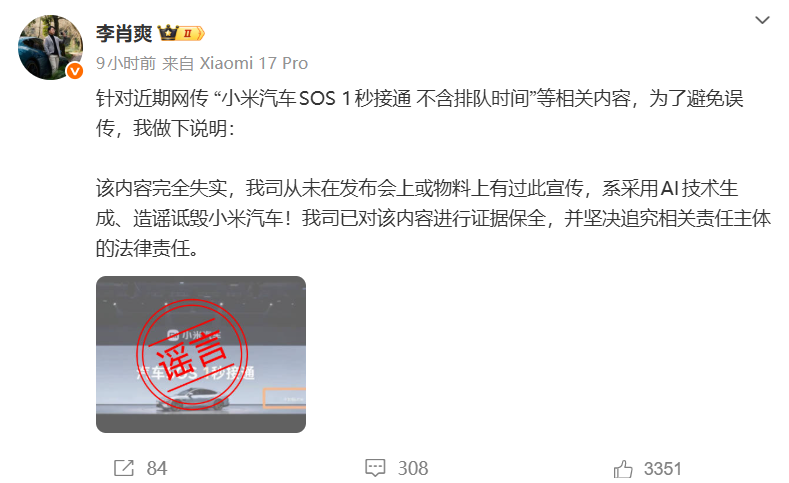 针对近期网传“小米汽车SOS 1秒接通,不含排队时间”等相关内容,小米汽车副总裁李肖爽在微博发文称:该内容完全失实,公司从未在发布会上或物料上有过此宣传,系采用AI技术生成、造谣诋毁小米汽车。公司已对该内容进行证据保全,并坚决追究相关责任主体的法律责任。
