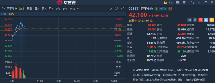 华盛资讯10月23日讯,巨子生物早盘一度涨逾13%,现涨超9%,报42.10港元,当前成交额超15亿港元。