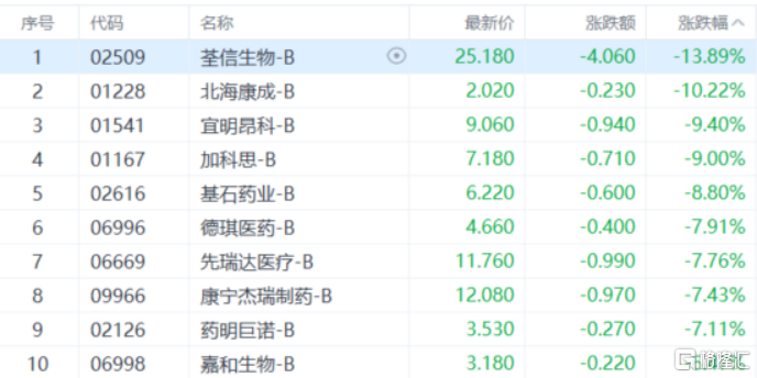 生物医药股下挫,荃信生物-B跌超13%,北海康成-B、宜明昂科-B、加科思-B等多股跟跌。