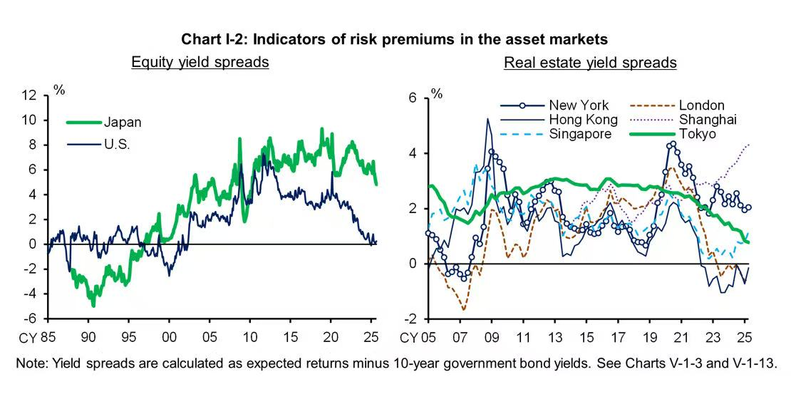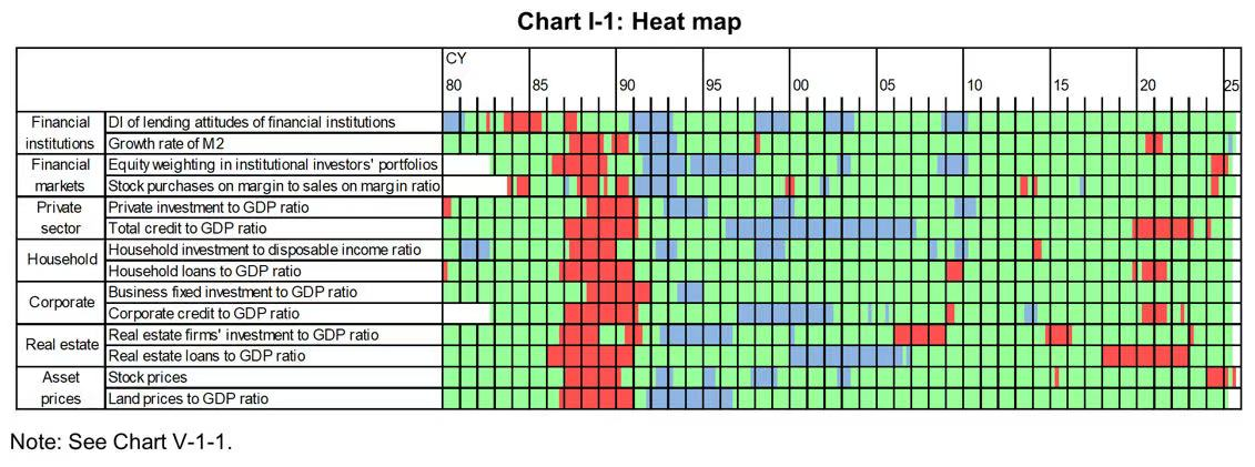 报告中一张金融失衡热力图显示,股价处于“红色”过热状态,表明股价偏离趋势向上(图I-1)。报告指出:“鉴于日本银行持有一定市场风险的股票,应密切关注包括股价在内的风险资产价格动态。”